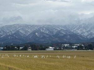 落穂拾いをする白鳥 ナイスライスファームの拠点となる阿賀野市内にある瓢湖は白鳥の飛来地として国の天然記念物に指定されている。