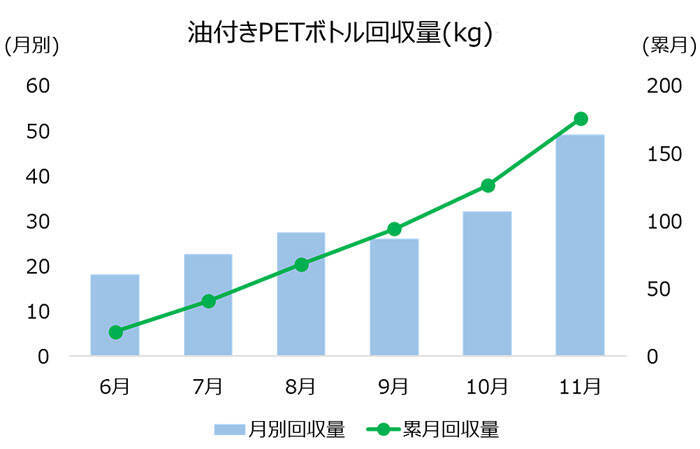 実証実験では、各店舗のリサイクルステーション周辺に回収ボックスを設置し、生活者が家庭で使用したドレッシングや食用油PETボトルの回収を実施。6月のスタート時は月間約20㎏だった回収量は月を追うごとに増え、最終11月には約50㎏程度に増加。回収された油付きPETボトルは事前に周知した出し方に則り、ほとんどがきれいな状態で、「生活者の資源循環に対する関心の高さ」が伺えたという。