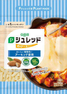 Q・B・B Pシュレッドのびーるタイプ150g23年に家庭用第1弾として発売した「Q・B・B Pシュレッド150g」は、植物性素材の中でもコクが出やすいアーモンドを使用し、チェダーチーズのようなコクと満足感、とろりとした食感が特長。3月1日から新発売した「同 のびーるタイプ150g」は、チーズのような糸引く伸びとミルキーな味わいが楽しめる。いずれもヴィーガン認証、プラントベース食品認証、ムスリムフレンドリーの推奨マークを取得し、パッケージでも分かりやすく伝えている。