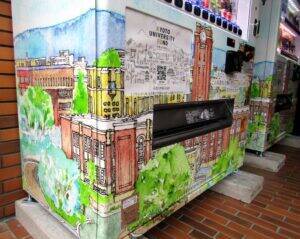 自販機には、京都大学を象徴する時計台の水彩画ラッピングが施され“この自動販売機の売上の一部は京都大学へ寄付されます”の文言があしらわれている。