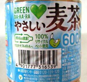 “100%リサイクルペット使用”と記載しているラベル裏面 「やさしい麦茶」は、発芽大麦の配合量を約30%増量して「従来からご支持いただいているすっきりやさしい味わいはそのままに、より麦の甘香ばしさを感じられる中味に仕上げた」(サントリー食品インターナショナル)。