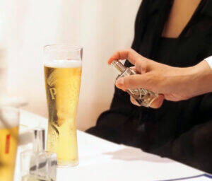「ローマの暑い夏に飲みやすいビールとして開発されたペローニは、日本の長く暑い夏にもぴったり。現在70か国以上で販売されており、このうち日本市場はいずれトップ5に入るものと確信している」。16日のメディア体験会で、アサヒビールのグローバルビアブランド室長・ニコラス・ラークワージー氏=写真㊧=が述べた。