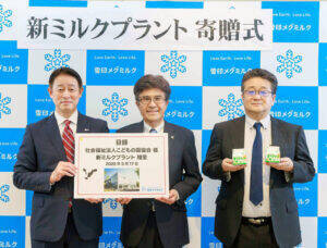 (左から)佐藤雅俊社長、秋保尚志園長、里平倫行常務理事兼副園長新ミルクプラント寄贈式で佐藤雅俊社長は、「雪印メグミルクグループが100周年を迎えられたのは、先人たちの努力と多くの皆さまからのご支援のおかげ」と感謝の意を表したうえで、「この新しいミルクプラントは、酪農の現場から家庭の食卓までをつなぐ“食育”の拠点として、次世代を担う子どもたちに牛乳乳製品の魅力を伝える場にしたい」と述べた。