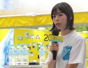 オリジナルTシャツを着用するサントリー食品インターナショナルのSBFジャパンブランド開発事業部の稲垣亜梨沙氏 「CLOUDY」に白羽の矢を立てた理由について、1日、会場で取材に応じたサントリー食品インターナショナルのSBFジャパンブランド開発事業部の稲垣亜梨沙氏は「サントリー天然水では『ウォーター・ポジティブ』のコミュニケーションを展開しサステナビリティを大切にしている。活動のフィールドは違えど、『CLOUDY』さまも未来をよりよくしていく思想を持たれ実際に活動されているところに共感した」と説明する。