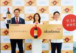 20日の会見でサントリーの吉雄敬子常務㊥ら市場の主力を占める800円以下のデイリーワイン、2000円以上のプレミアムワインに比べ、中間の価格帯では国内産ワインが1割程度と手薄になっていた。税込1300円程度の店頭価格を想定する新商品で、選択の幅を広げる。