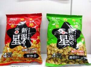 左から「新潟の星 甘から」「同 青のりしょうゆ」 「新潟の星」は、構想30年という歳月を経て2022年11月にテスト販売され、その後、大きさや風味を見直し23年9月から「甘から」「青のりしょうゆ」の2品を発売している。