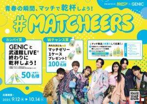 男女7人組ダンス&ボーカルグループ・GENICを起用したスペシャルキャンペーンを実施 同キャンペーンは、 Xかインスタグラムに#MATCHEERSのハッシュタグを付けて「マッチ」で乾杯している写真を投稿するなどして応募すると、抽選で50人にGENICと武道館ライブ終わりに乾杯できる特典などが当たるもの。