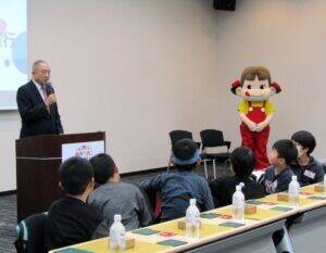 11月15日、都内で開催されたイベント「藤井聡太さんに挑戦!ペコちゃんこども将棋塾2025」で冒頭挨拶した河村宣行社長は「藤井先生が中学生でプロの棋士になりたての頃、対局の場に『ルックチョコレート』をお持ちになった。