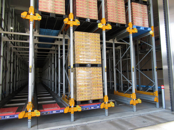 倉庫内でパレットの運搬には無人フォークリフト「AGF」を活用。労働力不足が課題となる中、人手では負担の大きい作業をロボットが24時間稼働で代替している。