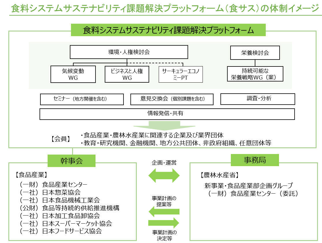こうした動きへ対応するため、サステナビリティ課題について深掘りし、より緊密に官民が連携した検討を行っていくため、FSPPPを発展的に解消したうえで、令和7年度より食料システムサステナビリティ課題解決プラットフォーム(通称:食サス)が設立されました。本食サスプラットフォームについても、引き続き当食品産業センターが事務局を請け負い、積極的に対応しているところです。