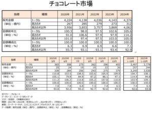 インテージSRI+では24年販売金額は5.6%増の4374億円を記録。これを牽引した高カカオは14.2%増の312億円に達したものの、今年6月以降に失速。これにはコストプッシュによるさらなる価格改定が実施されたことで販売数量減少による販売金額の減少を招いたためとみられる。