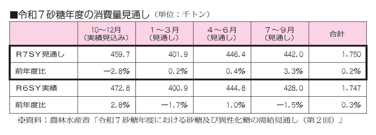 令和7砂糖年度第1四半期(令和7年10~12月)の実績見込みは45万9700tと前年同期比2.8%減となった。10月単月は一昨年10月急伸の反動減があったが、11月も5.2%減と厳しい落ち込みが続いた。