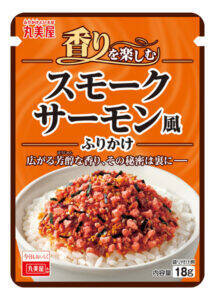 「スモークサーモン風」は鮭のうま味と風味に燻製の香りが調和したスモークサーモンのような味わいが楽しめる。スモークサーモンの香りを付与したオイルを製造工程の最後に回しかける「香り後がけ製法」を採用した。