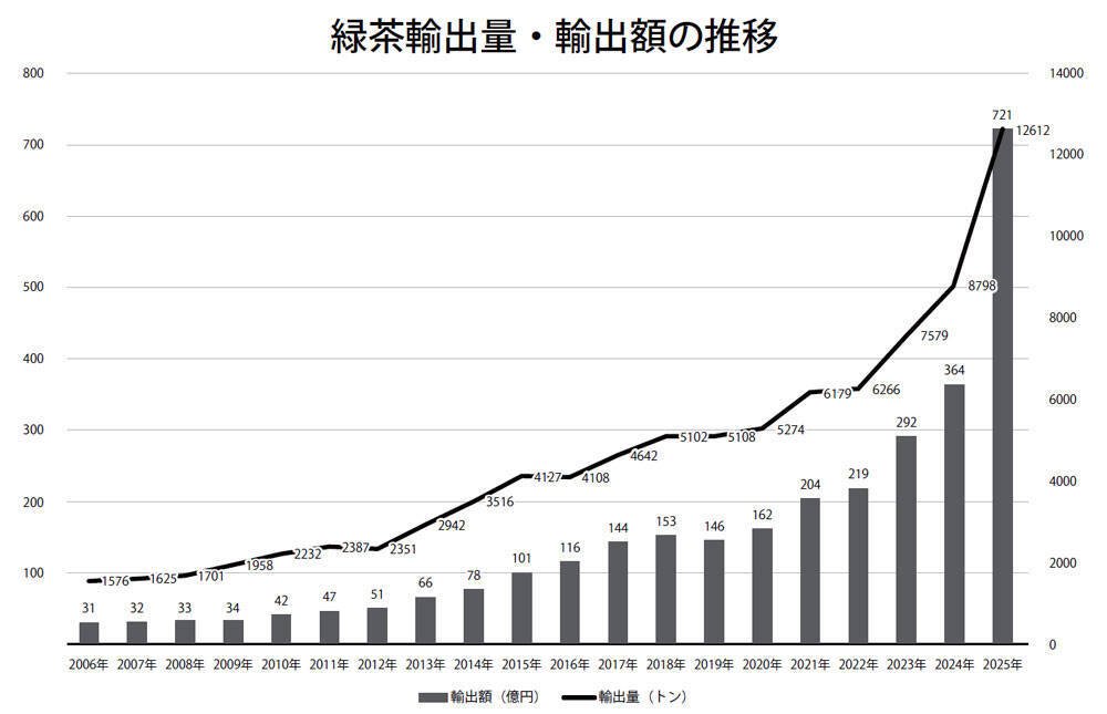 中でも緑茶は増加率が高く前年比357億円増(98.2%増)の720億9400万円。うち輸出量の69%、輸出額の84%が抹茶を含む粉末状茶。健康志向や日本食への関心が高まり、ラテやスイーツなど食品原料となる抹茶を中心に米・欧・ASEAN向けなどで著しく増加。日本食品海外プロモーションセンター(JFOODO)によれば、対米輸出では重量当たりの単価が中国産緑茶の5倍と高く、「Uji/Kyoto(宇治/京都)ブランド」も浸透し高品質な抹茶として高値で取引されている。