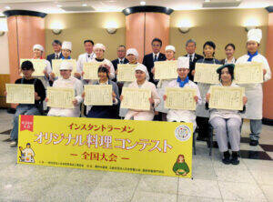 部門賞の優秀賞には「即席めん部門」が「包丁いらずなビビンバ風ラーメン」を作った永井菜羽さん(広島・17歳)、「カップめん部門」が「グラタン風うどん」を作った佐藤ひよりさん(山形・18歳)などの各賞を決め、賞状とあわせ副賞のギフトカード、即席めん3か月分などを贈った。