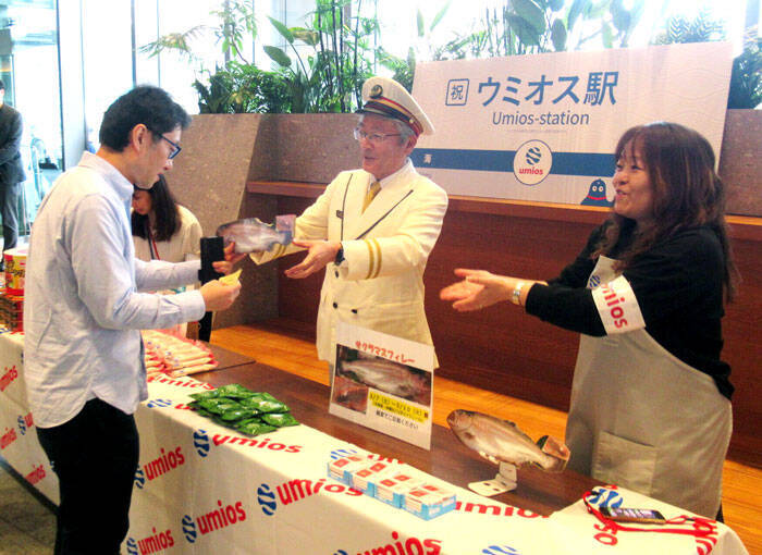 オープニングの冒頭、池見賢社長があいさつ。「当社グループは146年の長い歴史において、消費者の皆さまにおいしい魚を届けることを仕事としてきた。ただし最近は地球環境の変動等が影響し、水産資源が年々減少している。われわれは地球環境に配慮しながら、海を起点に人々や地球の健康をしっかりとお守りするという強い決意を持って、Umiosへの社名変更を決断した。マルハニチロ同様、皆さまにご支援していただけるように取り組みたい」と新社名に込めた想いを語った。