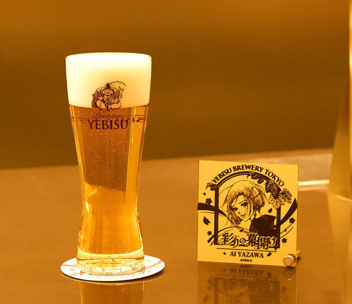 ここでしか飲めない「彩りの幕開け」。ロゴ入りのオリジナルグラスセットも販売矢沢さんとともにストーリーから考えて醸造された数量限定オリジナルビール「彩りの幕開け」や、描きおろしオリジナルグッズも会場で限定販売する。