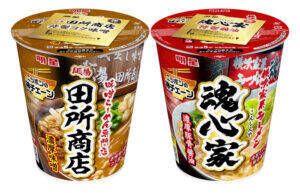新ブランド「ニッポンの神チェーン」 一方、市場で「プチ贅沢品志向」が高まっていることから、「ニッポンの神チェーン」ブランドを立ち上げ、「田所商店 濃厚味噌」と「魂心家 濃厚豚骨醤油」を3月16日から発売する。人気上昇中のラーメンチェーン店が監修した本格感ある味わいが特徴。手軽なタテ型ビッグカップ麺で楽しめる。
