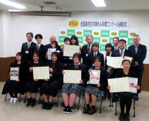 白潟昌彦会長(キンレイ社長、後列中央)と受賞者 その結果、最優秀賞に大分県立佐伯豊南高校の「うどんの恋人」チームによる「辛姫=写真」、優秀賞に群馬県立新田暁高校の「野球一筋!津久井兄弟」チームによる「母に捧ぐ、まるごと群馬のヘルシーつくねうどん」、奈良県立磯城野高校の「妃佳葵うどん研究部」チームによる「体ぽかぽかあんかけうどん」、FHJ賞に愛知県立瑞陵高校の「Brigade de cuisine」チームによる「うどんのミートソースパイ包み バジルクリームソース」、日本冷凍めん協会賞に広島県立沼南高校の「AKABA」チームによる「スープパスタ風ラーメン」を決定。学生たちは「今回の挑戦を将来に生かしたい」「友人と協力して作り上げることができた」と喜びを語った。