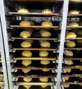 「サクふわメロンパン」の発酵過程 特徴の1つに、効率化と手作業を組み合わせた生産体制にある。商品改廃の多いコンビニパンでは完全自動化が難しく、トッピング作業や焼き目の確認など一部工程を従業員が行うことで品質を担保する。