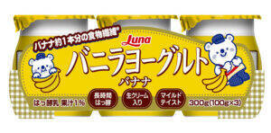 「バニラヨーグルト バナナ」 主力の「バニラヨーグルト」では、ファンコミュニティで多く見られた「バナナを加える食べ方」を踏まえ、「バニラヨーグルト バナナ」(税込327円、100g×3)を投入。バナナ1本分の食物繊維を配合し、朝食や間食の栄養ニーズにも対応する。