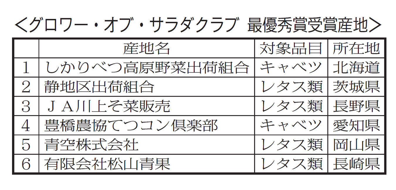 サラダクラブは4月17日、都内で全国の350団体から原料の品質や安定供給の観点から優れた原料産地を表彰する「グロワー・オブ・サラダクラブ」を開催。今回で10回目を迎える産地表彰で6産地が最優秀賞を受賞した。ほかにも優秀賞として12産地を、特別賞として3産地を表彰した。