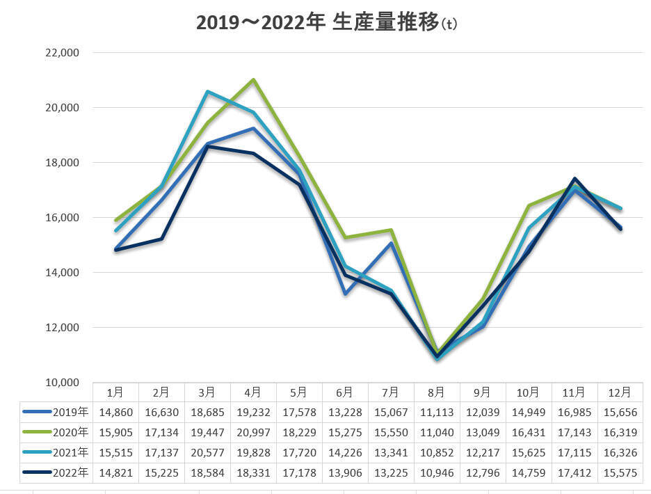 食品需給研究センターが発表した22年の乾麺生産量(そば粉を含む)は前年比96.1%の19万5千558tとなり、19年以来3年ぶりに20万tを下回った。コロナ感染拡大の巣ごもり需要で20年に市場が復活したものの21、22年は反動減となった。