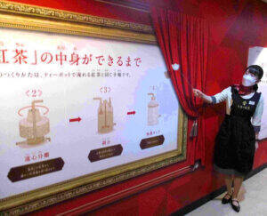 ブランドカラーの赤色を基調とした見学通路ブランドカラーの赤色を基調とした見学通路には「紅茶の中身ができるまで」「透明な紅茶の発明」といった独自のおいしさの秘密を説明するパネル展示や、籠を背負い茶摘み農家を疑似体験できるコーナーも設置されている。