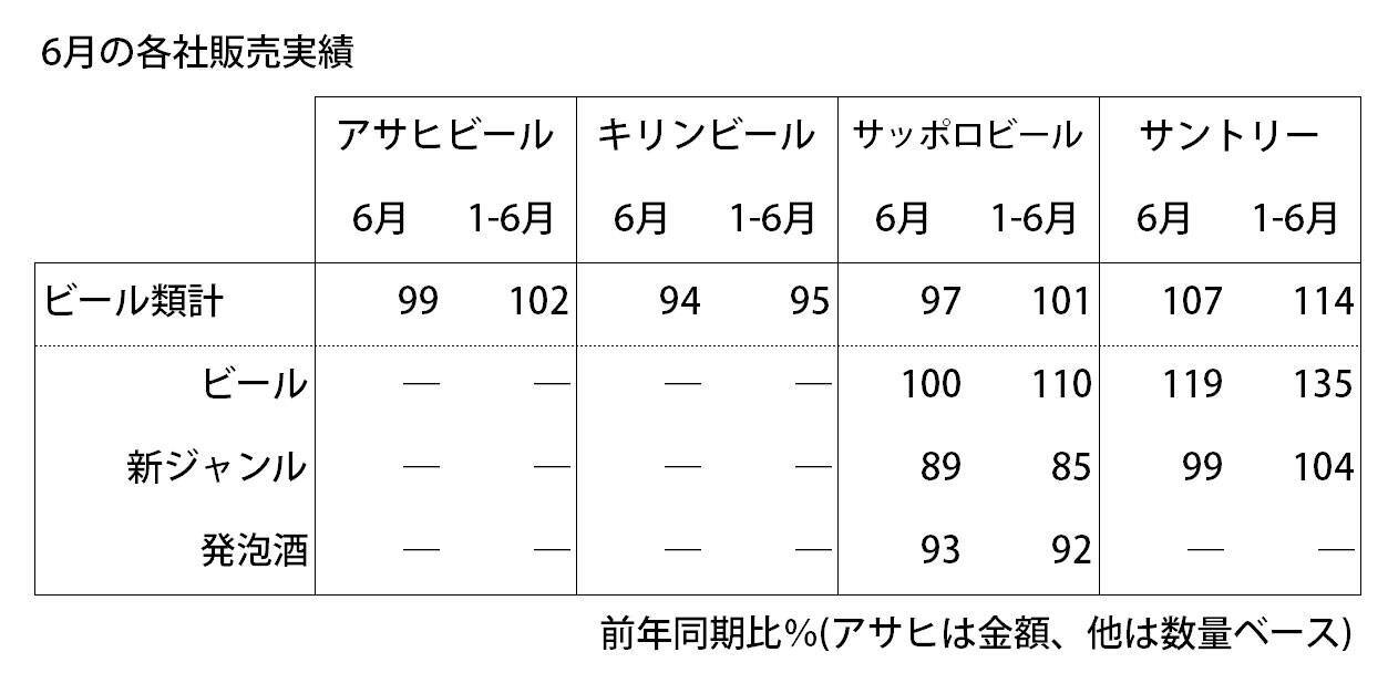 主要ブランドの上期実績は「スーパードライ」(アサヒビール)が104%、「一番搾り」(キリンビール)が108%、「黒ラベル」(サッポロ)113%など。ビールカテゴリーが35%増で推移するサントリーは主力「ザ・プレミアム・モルツ」が堅調さをみせるほか、4月発売の新ブランド「サントリー生ビール」の販売計画を上方修正するなど好調だ。
