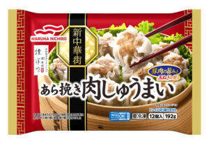「新中華街『あら挽き肉しゅうまい』」(マルハニチロ)加工食品部門では、缶詰の「どん帳」シリーズに「さば照焼き」を追加。旬の国産さばをこだわりの2段焼き製法で香ばしく仕上げた。すりみ食品の「こだわり魚種」シリーズは魚種と産地が訴求ポイント。今回の新商品「北海道産鮭を使ったお魚ソーセージ」も本来の旨みと風味を存分に味わえる。