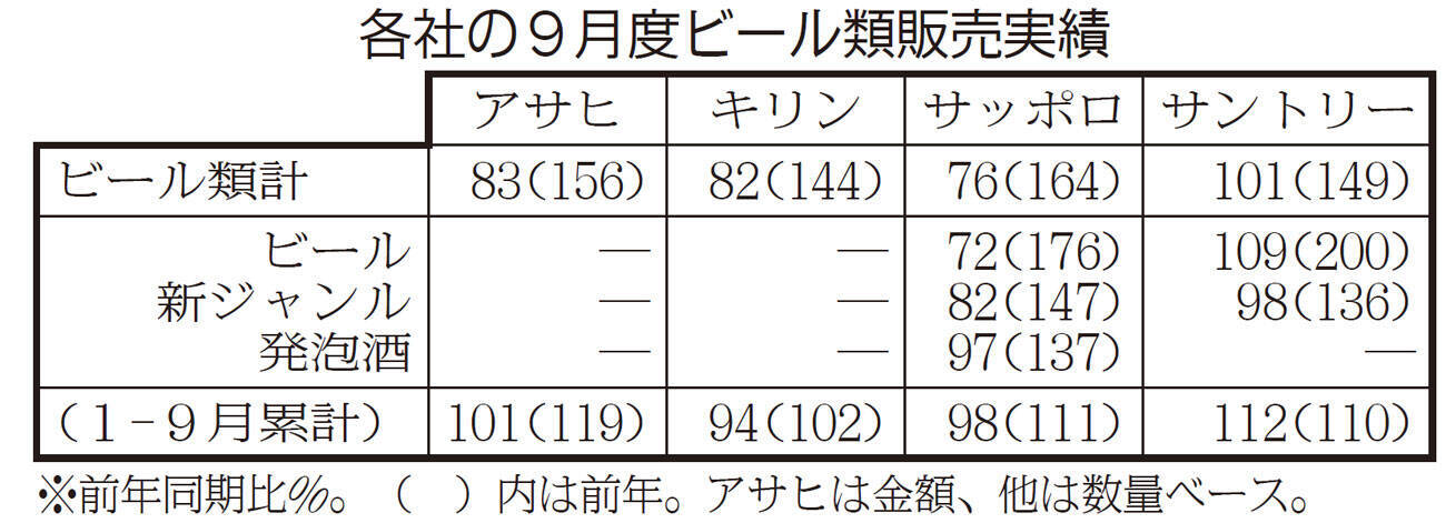 酒類大手の9月度実績は別表の通り。ビールは減税を前にした買い控えから、市場全体で74%程度とみられる。新ジャンルも低迷基調の継続に加えて、前年の仮需では3割以上の伸びを示した反動から、市場は推計84%と前年割れ。ビール類市場全体では約83%となった見込み(キリンビールなど推計)。