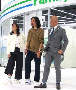 「コンビニエンスウェア」(ソックス)を披露する細見研介社長(右)とファッションショーを企画し「コンビニエンスウェア」のデザイナーを務める落合宏理氏(中央)、島田奈奈執行役員商品本部本部長 「ファミフェス」の開催は、この流れを受けたもので、開催を皮切りに新時代のコンビニ像を創り上げていく。