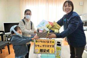 贈呈の様子。宿泊施設「リラのいえ」(神奈川県)にて2023年12月22日には宿泊施設「リラのいえ」に、ファミリーマート社員と同会に参加するこどもたちが訪問し、本やDVDをプレゼントした。こどもたちによるピアノ演奏と朗読会が開催された。PB「ファミマル」の菓子やコーヒー、レトルト食品なども贈った。