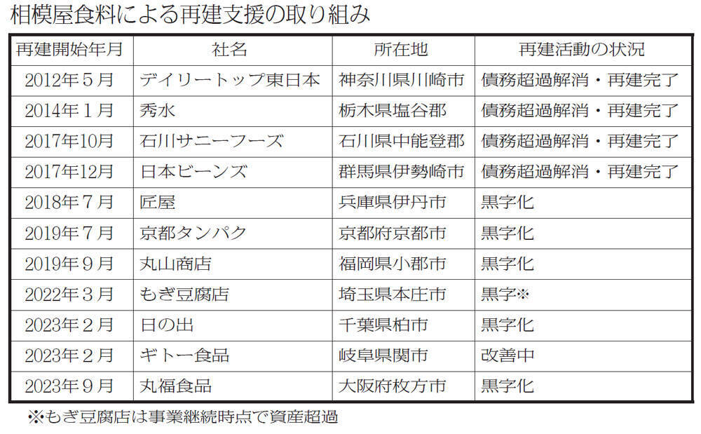 相模屋食料は豆腐業界の再編に向けた取り組みを積極的に進めている。規模やエリアにこだわらず支援を行い、これまでに豆腐メーカー11社が同社グループとなり、事業を継続している。すでに4社が債務超過解消、5社が黒字化。1社が黒字化に向けて取り組みを進めている。