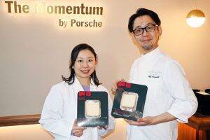 ハナマルキの國吉優子ブランド戦略室長㊧とThe Momentum by Porscheの林祐司シェフ3月11日から同31日まで、「The Momentum by Porsche」で、塩こうじチーズを使った特別メニューを提供。また、期間中は店頭で商品の販売も行う。3月11日に同店で記者発表会と試食会が行われた。