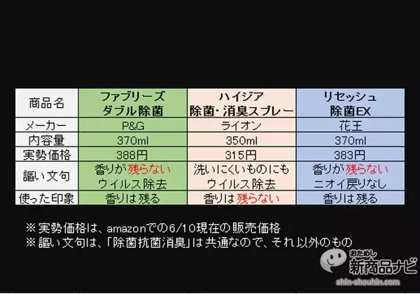 「消臭スプレー3種比較!『ファブリーズ』『ハイジア』『リセッシュ』使って調べたが、違いはあるか?」の画像