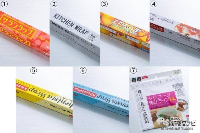 会社の近くにある100円均一(ダイソーとセリア)で、7つの商品を購入した。原材料を確認すると、「ポリ塩化ビニリデン」「ポリエチレン」「塩化ビニル樹脂」「シリコーン樹脂」の4種類あるのが分かる。購入サイズは、基本的には、幅30cmの大きいサイズを購入したが、そのサイズが店頭に置いてない場合は幅20センチほどのサイズを購入した。どれも同じ110円で購入する場合、原材料により長さもかなり変わるようだ。繰り返し使用できる「シリコーン樹脂」を除くと、「ポリエチレン」、「塩化ビニル樹脂」、「ポリ塩化ビニリデン」の順で長い。