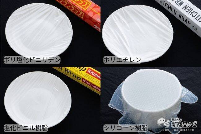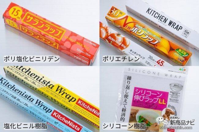 今回購入したキッチンラップは、「ポリ塩化ビニリデン」1つ、「ポリエチレン」3つ、「塩化ビニル樹脂」2つ。さらに、繰り返し使用できる「シリコーン樹脂」を1つだ。