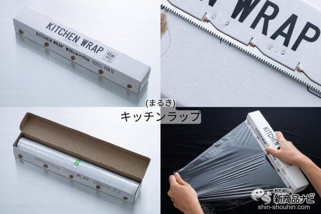 まるき(大阪府)『キッチンラップ』(幅30cm×長さ45m・参考価格 税込110円・発売中)は、セリアで購入できる、白い箱に黒文字のシンプルな見た目のキッチン用ラップ。