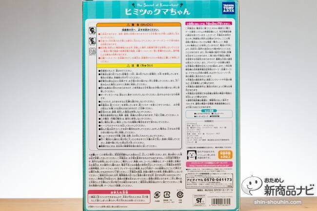 『ヒミツのクマちゃん』は対象年齢3才以上だが、「こどもはぜったいに開けないでください!」と書かれている不思議な箱に包まれている。箱の大きさは、こどものランドセルくらい。クマちゃんによると、ボクは「ぬいぐるみとお友達になりたい」そう思うこどもたちへの贈り物・・・(中略)クマちゃんの秘密を守ってくれる大人の方だけ、開けてくださいね、ということだそうだ。