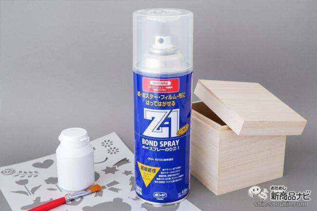 ステンシルシートを使ったDIYにチャレンジ。今回は無地の木箱にクリスマスモチーフをステンシルしてみよう。ステンシルをしたい面にピタッとステンシルシートを貼りつけることが、綺麗に仕上げるポイント。そこで『ボンド スプレーのりZ-1』が活躍する。