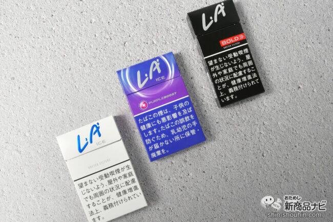 『L.A.』のラインナップは「L.A.アイス パープルブースト」(16本入・価格 税込500円)、「L.A.ボールド」(12本入・価格 税込350円)、「L.A.アイス」(16本入・価格 税込500円)の3銘柄。