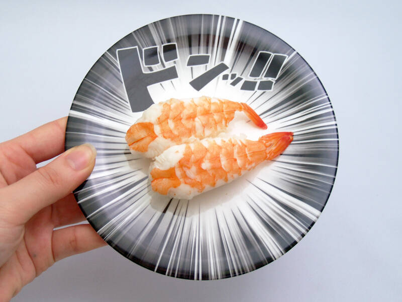 メラミン樹脂性の皿に、マンガの擬音や背景が、丁寧にプリントされている。いわゆる『回転寿司の皿』といえば、質感がご想像頂けるだろう。