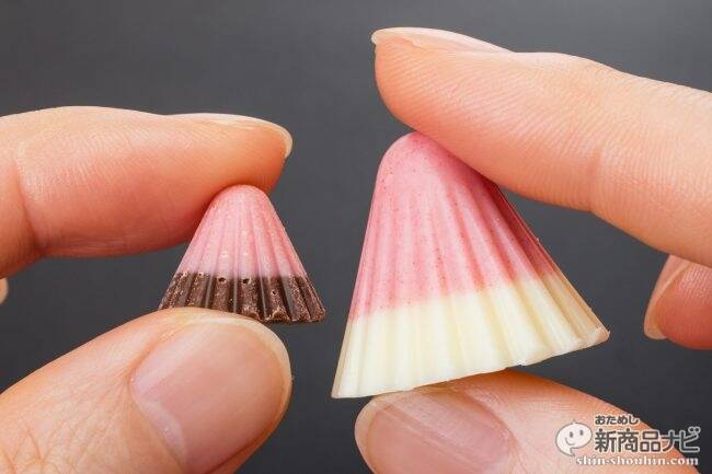 肝心なアポロは大粒というだけあり、通常のアポロの2倍はあるだろう高さ約2cmのビッグサイズ。いちごとミルクの綺麗な2層に分かれている。いちご部分をよく見ると、濃いピンク色をしたパウダーのようなものが見える。これが甘酸っぱさの秘密なのか!?