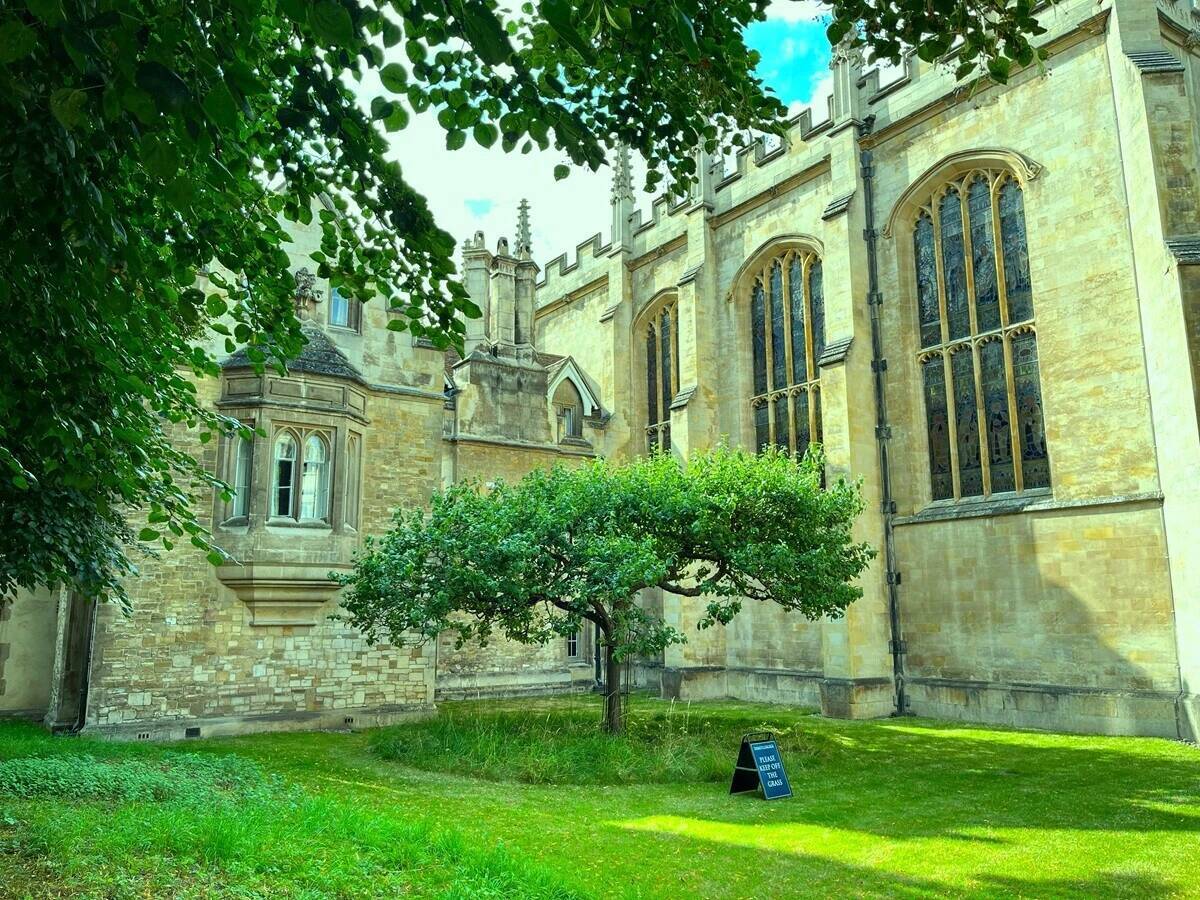トリニティカレッジの入り口横にある、「ニュートンのリンゴの木」。ニュートンはここで、万有引力の法則の発見につながるひらめきを得たと言われている。