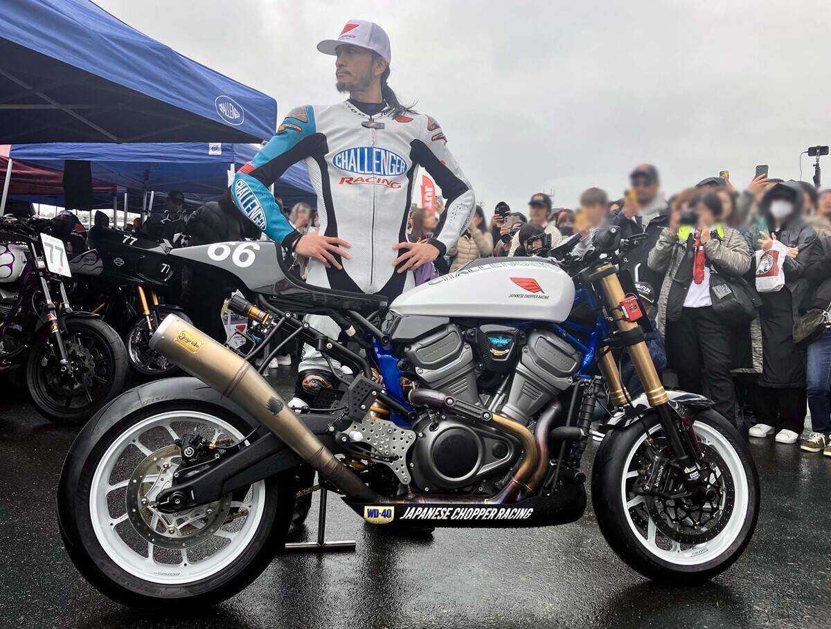 長瀬さん(中央)のマシンはアメリカのハーレーダビッドソンの大型ツーリングバイク、Pan America。これをベースにサーキット仕様に改造してレース参戦し、富士スピードウェイで開催された クラブマンロードレース第2では2位表彰台を獲得している