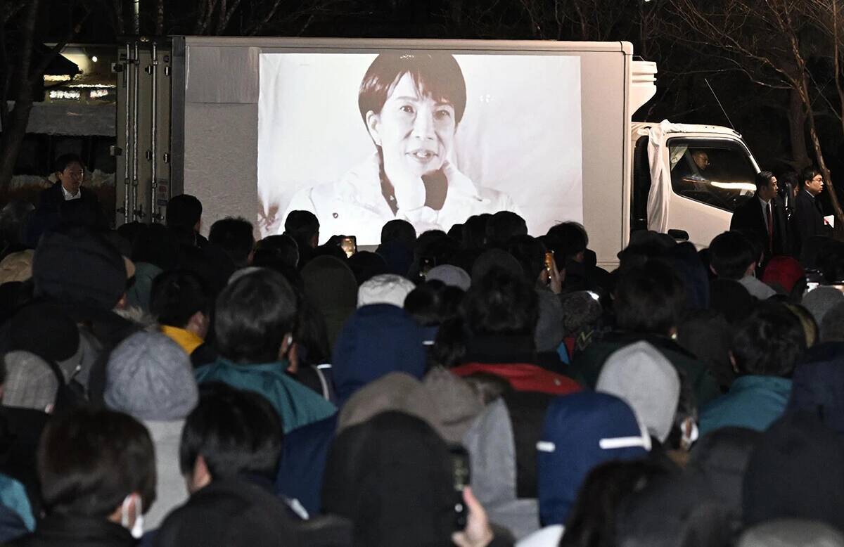 スクリーンに映し出された、街頭演説する高市早苗首相と、それを見る聴衆