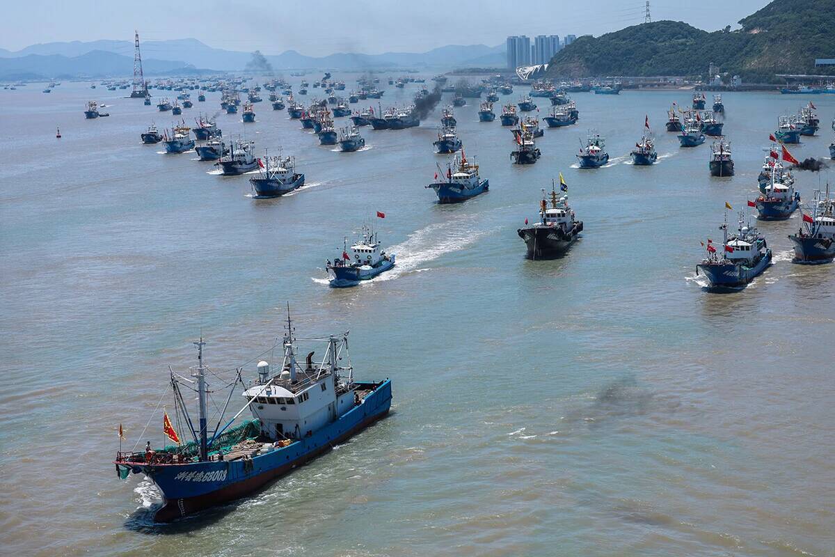 中国・浙江省舟山市沖の漁船群(2024年8月1日)。東シナ海は中国にとって重要な漁場のひとつで、イカやサバなど多様な水産資源が水揚げされる。大陸棚が広がる海域は比較的浅く、古くから漁業が盛ん