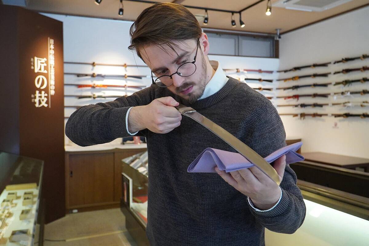 【刀剣の聖地に現れた〝青い目のサムライ〟】ショーケースから日本刀が取り出され、目の前に現れたその鋭利な美しさの前に誰もが息をのむ。