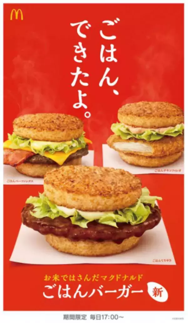 また、2月4日からは「ごはん、できたよ。」をキャッチコピーとして、新TV-CM「ごはんバーガー 窓際の女」篇 (30秒/15秒)、「ごはんバーガー 様々な人生」篇 (30秒/15秒)を放映する。夜のマクドナルド店内を舞台に、漫才コンビ「ナイツ」の塙宣之さん、俳優・高橋克実さん、元宝塚歌劇団花組の女優・真飛聖(まとぶせい)さんが出演する。